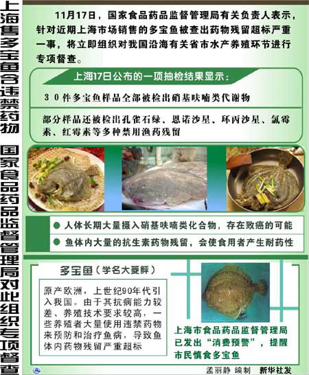 针对近期上海市场销售的多宝鱼(学名大菱鲆)被查出药物残留超标严重一事,国家食品药品监督管理局有关负责人17日表示,将立即组织对我国沿海有关省市水产养殖环节进行专项督查。