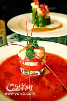选用意大利厚肉番茄,将番茄切片,把带子、鲜虾、青口、鱿鱼等海鲜与番茄相间叠起,配以芝士焗。焗好后淋上用牛奶、忌廉做成的白汁和番茄汁。海鲜肉质爽口,清甜,加上淡淡的芝士香,丰富了整体的口感。 (王敏)