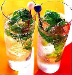 材料:白朗姆酒90ml、柠檬汁2小汤匙、胶糖蜜小汤匙、薄荷叶适量、松香叶6~8片、苏打水300ml