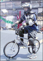 同时,头部稍稍抬起,注意车子平衡,直线加速前进。起跑到60—80米达一定速度后,运动员可平稳地 座到车座上。利用已有的惯性,稍放松踏蹬几下,调整一下因起跑产生的肌肉紧张状态,然后,立即转入正常踏蹬。这里要特别指出,由站立式往下坐时不要向后猛拉车把,防止车子减速。