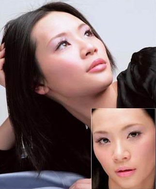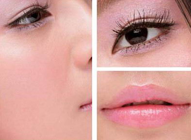 1、妆容的主题是呈现初春的冷色调光泽感,所以基础是通透的肤质感,要点是运用带有珠光的散粉整体提亮面部,并在额头、T字区,C区及下颌用白色珠光妆粉打造高光。作为辅助的眼妆和唇妆则选择冷色光泽的淡紫色搭配。