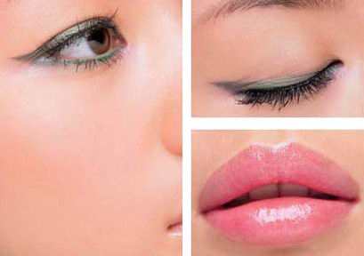 1、整个眼窝及眼角涂抹上一层珠光感粉色眼影,双眼皮处重叠涂抹米黄色眼影,带来微妙的深邃感。眼线选择带有金属色彩的绿色,注意从内眼角至外眼角的微妙过渡,外眼角眼线描画得稍稍外翘,更加增添魅力眼神,选择丰盈的睫毛膏制造出浓密的睫毛。