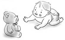 1将一个坐着直视前方的布偶放在宝宝的面前。