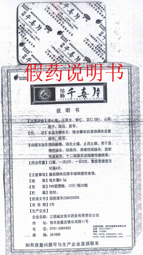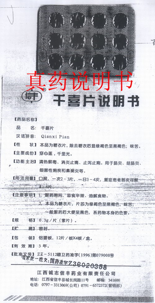 江西诚志信丰药业有限责任公司系该省合法的药品生产企业,“千喜片”为批准生产的品种。近日,在辽宁鞍山发现假冒该公司生产的“千喜片”,其外包装与真品有较大区别(详见附件)。