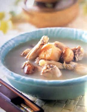 4 别取一锅,注入热水,再放入干贝、田鸡、姜、蒜头、酒,以中火炖2小时,最后起锅前再加上盐调味即可。