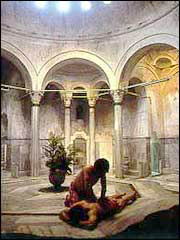 原来,信奉伊斯兰教的土耳其女子平时除了用头巾包住头和脸部外,还穿着厚实的长袍,外人无法看清女子的长相和身材,这样一来,土耳其浴室就成了未来婆婆挑选儿媳的重要场所。一般来说,未来婆婆在媒人的陪同下邀请未来儿媳一同沐浴。在浴室里,未来婆婆不仅要看儿媳的长相和身材,还要看她的骨盆,骨盆大的女子才能给家里带来多子多福的好运。另外,未来儿媳的体味如何,有没有狐臭也是考察的重点。由于土耳其人的饮食以奶酪和肉食为主,体味重在所难免,有狐臭的女子被认为是不吉利的,人们认为那是真主惩罚她的缘故。