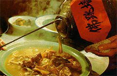 4、取能装2500克酒的酒坛一个,放入鸡、鱼翅、火腿、干贝、鲍鱼、香菇、冬笋,加鸡汤,茶叶封坛口,加盖小碗1个,烧沸后小火煨2小时,放海参、蹄筋、鱼唇、鱼肚煨1小时。