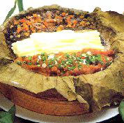 2、荷叶洗净,平摆于圆长竹笼中。将熟粉蒸肉,鱼条用豉汁、料酒拌匀,平摆于竹笼内两侧。萝卜丝用玉米粉、精盐拌匀,摆于竹笼中间。将荷叶包折起来,竹笼置蒸锅上蒸8分钟熟后,端立火口。