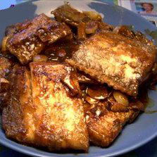 5.把准备好的(2)内碗汁倒入煎好的鱼锅里,大火烧开,再转入小火,鱼易熟,只要稍等,汤汁变粘糊状,就可以盛盘吃了。