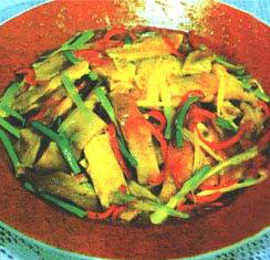 基本特点 此菜白、红、绿、黄四色相映,色彩朴素清新,鸡肉肥嫩异常、味道酸辣鲜香。