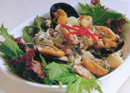 材料:中等大小的虾300g,墨鱼1只,巴非蛤300g,牡蛎4个,色拉用蔬菜(菊苣,洋生菜,红色卷心菜,红色菊苣),葡萄酒2大匙,柠檬1/4个,大蒜调味汁。休 闲居 编辑