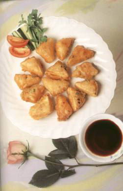 4、 烧滚油5杯,将豆腐每块沾匀上脆浆,放入滚油中,炸脆上碟。