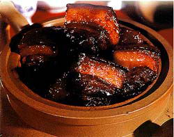3、将肉用漏勺盛起,装入小瓷缸或小沙锅内。每缸放三、四块肉,皮朝上,加一些原卤,加盖上笼用旺火蒸半小时即可