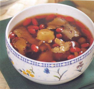 当归性温,味甘、辛,能补血 活血:枸杞性平、味甘,能滋 肾润肺、补肝明目。