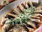 5 待鱼蒸熟取出,先拣除葱段、姜片,再放入沥干的葱、姜丝即可。
