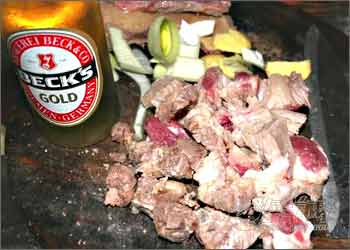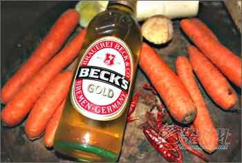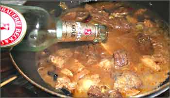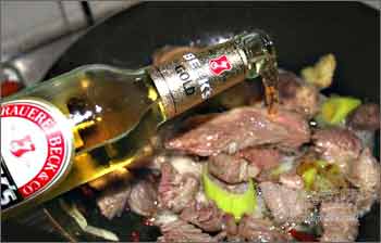 然后倒进牛肉爆炒一下,有红酒的就可以放一点,非常香,等都均匀暴炒过了,马上到一半啤酒接着炒一下