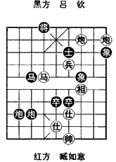 如图形势,是北京臧如意与广东吕钦在1984年“三楚杯”比赛中弈成的,现该黑方走棋。实战中,黑以攻守兼备的着法获取了胜利。