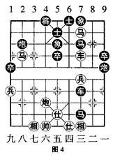 图4是第二届“棋友杯”象棋赛中,西安张民革对鞍山机伟所弈成的中局角斗场面。很显然, 红方欲做成马八进六再马六进入之连 一杀手段,但关键是必须先拦阻黑方边炮反照将解杀。只见红方突出妙手――喂车拦炮,从而打开先手攻杀之路。