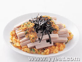(4) 把除水份的泡菜和凉粉装在大碗中﹐并加佐料酱拌好。盛在碗里撒紫菜。休闲 居 编 辑