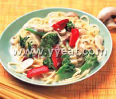 4. 捞起作法1的义大利面加入作法3的酱汁锅中拌煮1~2分钟,再加入甜红椒和花椰菜拌炒一下,即可起锅装盘。休 闲 居 编 辑
