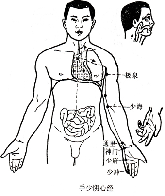 它的直行脉从心系(即心与它脏相联系的系带)上行至肺,向下出于腑下(极泉),沿上臂内侧后缘,走手太阴,手厥阴经之后(青灵),下向肘内(少海),沿前臂内侧后缘(灵道、通里、阴郄、神门),到掌后豌豆骨部进入掌内后边(少府),沿小指的桡侧出于末端(少冲),接手太阳小肠经。