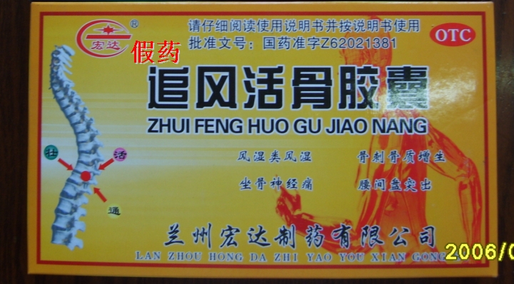胆香通窍鼻炎灵胶囊(标示兰州宏达制药有限公司生产;批号:050718;批准文号:国药准字Z62021384;规格:0.35g×12粒×2板×3小盒/盒);追风活骨胶囊(标示兰州宏达制药有限公司生产;批号:051229;批准文号:国药准字Z62021381;规格:0.35g×12粒/板×3小盒/盒)。