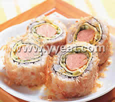 4.捲帘上舖一张保鲜膜,摆上海苔,平舖一层寿司饭,然后将海苔翻面,再平舖一层寿司饭,涂上混合抹酱,并依序放上黄金薄蛋皮、萝蔓生菜以及小黄瓜丝、肉松、热狗,捲成寿司卷,外表滚上一层柴鱼片即可。休 闲 居 编 辑
