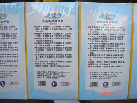 8月8日,该局执法人员在珊溪镇发现无证无照“业务员”俞某和马某正在一家药品零售企业推销避孕药具,在他们推销的避孕药具中有标示深圳永康乳胶厂生产的假避孕套。随即,执法人员对他们的送货车进行检查,发现其送货车上有大量的避孕药和避孕套,货值近万元,其中有15个品种的避孕套标示深圳永康乳胶厂生产,品名分别为“大长今”、“两只小蜜蜂”、 “二人转”、 “白娘子”、“楚留香”、 “嘻唰唰”等,其包装上标示的注册号都是:粤药器监(准)字91第267011号。执法人员当场对上述避孕药具进行查封扣押,并对该当事人进行了调查。据涉案当事人俞某和马某初步交代,这些避孕套是今年6月份从郑州人王某手中购进的,主要销往温州各县市和青田等地药品零售企业与保健品店。目前,该案正进一步处理中。