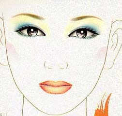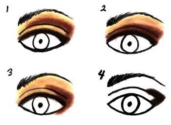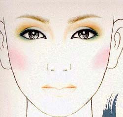 利用暗色增加眼睛中央的面积将亮色如同环绕眼尾一般地由眼窝涂刷至下眼睑,而暗色则涂满于双眼皮内,最后将瞳孔上隆起部分刷成晕成山形。