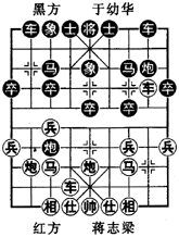 (局例)如图,是1983年全国个人赛中,安徽蒋志梁对浙江于幼华过招到第10回合时出现的中局形势,由“中炮盘头马直横车对屏风马上左象”布局演变而成。枰面上,双方大子、士相(象)都齐全。红方以左横牢控制肋道,右车过河,两只主力车占位甚佳,配合中炮盘头马发动进攻。黑方多一中卒,因势利导,明守暗攻,频频用计应敌。现在轮到黑方走子,实战着法如下:
