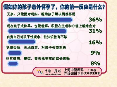 你看,家长在合适的情况下,给自己的孩子说有关避孕方面的知识,这是必要的。专家说,这叫未雨绸缪,但有的时候,这伞还没有来得及做准备呢,这雨就下来了,遇到这种情况家长们又该怎么办呢?我们也就这个问题做了一个调查,这是和中智库玛合作,调查的是1198名女中学生的家长,假如你的孩子意外怀孕了,你的第一反映会是什么?无奈,只能面对现实;帮助孩子解决困难;现在孩子成熟早,也能理解,积极在生理和心理上帮她应付,自责自己在性观念、性知识教育不够;觉得丢连脸,无地自容,对孩子失望至极,还有就是非常愤怒,要去找男孩的家长算帐。