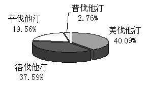 2002年我国四种他汀类原料药总产量为46.207吨。其中,洛伐他汀的产量为33.24吨,占71.94%;辛伐他汀的产量为9.668吨,占20.92%;普伐他汀的产量为1.583吨,占3.43%;美伐他汀的产量为1.716吨,占3.71%。2002年出口洛伐他汀33.24吨。