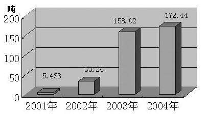 图2:我国2001年~2004年四种他汀类原料药出口增长态势
