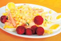 制作: 先将苹果及橙子榨汁,以此把梅子酱调汁,备用;将新土豆洗净煮熟,切小块,胡萝卜洗净切小条,水煮蛋切片;把所有准备好的原料放入沙拉盘中,淋上调好的梅子酱汁和沙拉酱即可食用。