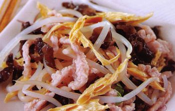 材料:水发腐竹50克,豆芽、水发木耳、肉丝各100克休 闲 居 编 辑