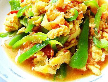 原料:鸡蛋2只,番茄100克,青椒100克,葱花5克,麻油5克,精盐、味精少许。