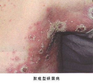 脓胞型银屑病:这一类型又有两种,一种是限局型的,只是在手掌和足底或身体其他部位出现红斑,红斑上有密密麻麻的小脓疱; 另一种是全身泛发,这种类型比红皮病型银屑病还少见,其病情更严重,治疗也更困难。泛发性脓疱型银屑病多为急性发病,可在数日至数周内脓疱泛发全身,先有密集的针尖大小的潜在的小脓疱,很快融合成脓湖。全身各处均可发疹,但以褶皱部及四肢屈侧为多见。有时甲床可出现小脓疱,甲板肥厚混浊。常伴有高热、关节肿痛及全身不适,血常规化验可见白细胞数增多。脓疱干涸后,随即脱皮屑,皮屑脱落后又紧接起新的小脓疱;病程反反复复可达数月或更久。脓疱型银屑病的病因不清楚,近年来由于不正规地应用皮质类固醇激素治疗寻常型银屑病而引起泛发性的脓疱型银屑病的病例常见报道。脓疱型银屑病在治愈过程中常常可出现寻常型银屑病损害。限局性脓疱型银屑病以掌距脓疱型银屑病为多见,在双手掌和足柘部位有对称性红斑,红斑上出现许多针头大至粟粒大小的小脓疱,脓疱的疱壁厚而不易破,大约1一2周后自行干涸,出现小片的皮屑,刮去皮屑后可发现小出血点。在皮屑下又可发现成群的新的小脓疱,反复绵延。皮损有瘙痒及灼痛感,有时件有低热、头痛及食欲不振。手指甲和脚趾甲常常肥厚变形,并形成不规则的脊状隆起,色泽混浊,严重者甲下可积脓。病程顽固,一般治疗效果差。
