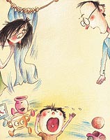 有一天,当米米坐在地板上又开始大哭特哭,怪事发生了:桌子上的杯子轻轻晃动起身子,接着,它跳下桌子,一溜烟跑出去了。